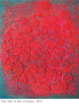이러한 현상들은 각각의 그림을 통해 보여진다. 작품 <Land of Star Calm (2011)>에서 우리는 밝은 파랑과 핑크색이 덧칠해진 눈물 모양의 원형들이 옅은 색깔로 모여있는 것을 볼 수 있다. 이 가운데에는 태양과 흡사한 노란색의 원반 모양이 있는데 이는 전체적으로 별들로 뒤덮여 있는 구성이다. <Land of Star Calm>는 우리가 살고 있는 것과는 다른 세상의 우월함을 설득하고 있다. 작품에 있어 아주 조용한 분위기는 현대 삶에서 쉬이 찾을 수 없는 명상적인 평온으로 안내해 주면서, 상상의 안식처를 작품제목에서와 같이 보여주고 있다. 다른 작품 <Stars (2011)>은 표면이 얕게 돋을 새김한 겉면처럼 거칠고, 전체가 오렌지색으로 구성되어 있다. 그림에서 발광하는 오렌지 색조는 작가의 비구상적인 존재에 대한 성향을 보여주며, 자연에서 실제로 보여지기 힘든 색조들은 그림을 완성하게끔 하는 울퉁불퉁한 표면들을 활성화시킨다. 추상작품, 특히 모노크롬 회화에 속하는 작품은 자기 지시적인 경향이 있는데, 이것은 어떻게 작품 <Stars>가 비구상적인 자연을 가리키는지 염두해 보았을 때 흥미롭다. 사실 이해할만한 관계성이 많이 있지는 않다; 작품의 제목과 그것의 시각적 존재는 임의적인 방식으로 엮여 있는 듯 하다. 하지만 여전히 묶음이라는 개념은 별의 광채를 그리는 작가에게 중요해 보인다. 어쩌면 작품제목과 작품의 관계는 자연 속에서 시적이고 생략적인 것 일지 모른다.