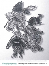 ..... 작가 송계영은 바이오테크놀로지(생명공학)에 관심이 많으며 동식물의 유전자, 염색체, 세포 등을 인간이 작위적으로 변형하는 것에 주목한다. 자연적 상태에서 변형된 유전자는 이전과는 전혀 다른 종으로 새로운 삶을 요구한다. 송계영은 바로 이 지점 ‘유전자 조작이 과연 새로운 종의 탄생을 축하하는 차원으로 가고 있는가?’라는 점에 의문을 제기한다. 그녀는 인간을 위한 자연 질서의 변형 혹은 변경이 인간을 이롭게 하는 최선의 길인가, 아니면 인간이 생존하기 위한 필연의 길인가에 대한 질문을 우리 스스로에게 던져야 한다고 말한다. 산업혁명 이후 공장의 컨베이어 벨트 위로 수없이 쏟아져 나온 대량생산의 제품처럼 21세기 우리는 살아있는 생명체의 몸뚱아리를 제품으로 생산하고 있다. 오이와 고추를 이종 교배한 식품이 식탁 위에 올려지고 있고, 돼지의 세포에서 단백질을 추출하여 인간의 의료용으로 사용하며, 인간의 장기가 실험실 유리관에서 배양되고 있다. 그뿐인가? 빨간색 프리지아 꽃에 행복해하고, 수박만한 사과에 허기를 달래며 유전자변형 옥수수를 동물의 사료로 주고 있다. 이러한 모든 것들이 생명공학의 눈부실 발전 덕분이다. 대량생산의 메커니즘은 살아있는 생명체를 이미지화하여 무한복제로 마구마구 찍어낸다. 송계영은 이를 21세기 ‘생명체 공장 시스템’이라고 말한다. ‘공장’은 식물과 동물, 인간 종을 가리지 않고 끊임없이 수용하고 생산한다. 복제는 이제 수단이 아니라 방법이 되었다. 상품가치가 변형과 복제를 결정한다. 그녀는 <식물세포공장>, <동물공장>, <프랑켄슈타인> 등 유전자재조합기술(Recombinant DNA technique)에 의해 탄생한 유전자변형생물체(GMO)를 작품으로 선보였다. 작품은 한지를 컷팅하여 표면에 흑연을 도포한 것인데 이는 그녀가 표현하고자 하는 유전자 변형의 개념과 맞닿아있다. 그녀에게 한지는 매우 특별한 재료인데, 종이의 응축력, 긴장과 이완, 강도 등 자연의 살아 숨 쉬는 유기적 섬유질이라는 점이 중요하다. 유기적 구조를 가진 종이 자체에 왁스나 기름, 흑연 등을 바름으로써 자연 상태가 아닌 인위적인 상태, 즉 현대사회의 생산품이 된다는 것이다. 그녀에게 종이의 인위적인 상태는 바로 유전자 조작과 같은 비자연적인 상태로의 이행과 같다. 흑연을 입힌 유전자 변형의 이미지는 결코 되돌아갈 수 없는 비자연의 상태, 환원 불가능한 비유기적인 상태가 되는 것이다. 그녀의 <식물세포공장>은 돌이킬 수 없는 유전자 조작의 상태를 잘 보여준다. 각종 식물세포들의 셀이 합쳐진 거대한 식물덩어리는 미래 자연환경을 구성하는 나무와 숲이 될 것이다. 이제껏 자연계에 없었던 생명체를 ‘프랑켄슈타인 생명체’라고 부르듯이 그녀의 작품 안에서 무수히 많은 생명체들이 뒤섞여 거대한 ‘괴물’이 되고 있다.
