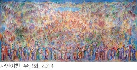 그림에 등장하는 모든 인물들은 작가 자신의 자화상으로 보인다. 시시각각 변화무쌍한 인간으로서의 자신의 모습을 순간순간 담아내었다. 인물들의 구체성, 혹은 특정 감정과 시점에서의 주장이나 의지를 주목하기보다는 흐름이라는 커다란 변화의 기운, 역사적인 흐름이나 서사적인 기운 속에 녹였다. 의도했다기보다는 자연스런 기운으로 인물을 드러내면서 전체적인 변화를 보이고 있다. 강화시절 작업의 특징 중 하나다. 세상살이에서 경험한 분노와 격정의 감정을 직접적으로 강조하던 박진화는 그것을 화합과 통합, 네오내오 구분 없는 평화와 안식의 터전 속에서 하나된 모습으로 승화시켜 나가고 있다. 흡사 종교적 기운까지 감지되는 그의 그림은 현세구복/극복에의 바람을 하나의 커다란 물결로, 흐름으로, 몸으로 연출해내고 있다. 초대형 화면은 마치 웅장한 메시아를 듣는 것처럼 수많은 사람들을 하나된 몸으로, 하나된 그 무엇을 향해 나아가고 있는 장관으로 연출하고 있다.