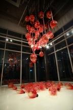 이번 전시는 언어와 논리에 앞서는 인식의 흐름을 시각화하려는 지속적인 미술 설계의 어느 부분을 사방이 훤히 들여다보이는 유리상자 공간에 담아내려는 작가의 제안으로부터 시작됩니다. 이곳 6×6×5.5m 크기의 유리상자 내부 천장에 매달거나 바닥에 펴놓은 77개의 투명하고 붉은 덩어리는 작가가 입으로 취입吹入하여 만든 유리조형입니다. 짐작하듯이 쇠로된 파이프 끝에 뜨겁게 녹인 유리 덩어리를 묻혀 숨을 불어넣어 부풀리는 유리 취입 행위는 상당히 오래된 유리 가공법이며, 이는 작가의 호흡과 신체행위가 작업과정에 일체되어 긴요하게 결합하는 장인匠人의 태도가 요구되는 작업이고, 현재의 디지털 문명과는 대척되는 아날로그적 감성과 탄생의 숨을 불어넣는 고귀함, 인간적인 손맛이 느껴지는 매력적인 행위입니다. 이러한 감성적 지향을 담은 작가의 유리조형 행위는 현재의 시간과 공간을 초월하여 과거의 기억과 잇는 정신적인 미술 행위로서 인간 삶의 망설임과 변화의 순간마다 기명記銘, 보유保有, 재생再生, 재인再認의 단계로 기억하는 인식체계의 주목으로부터 기인합니다. 이규홍의 신체행위는 생의 현실에서 경험했던 불안과 소외의 시간을 잊고 전혀 다른 충만의 기억으로 재생하고 재인하려는 몰입沒入 장치이며, 자신의 감수성과 직관 그리고 반복과 지속을 더하여 붉은색의 투명한 유리 덩어리를 포개고 나열하는 ‘자연의 침묵’이라는 입체 그림으로 남겨집니다.