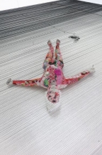 벽면 얼굴의 아래에는 좌우벽면 사이를 검은 실로 촘촘히 이어 만든 세로4.9×가로4.9m 정도의 사각 수평면이 바닥으로부터 30㎝정도 띄워져 설치되어 있다. 이 풍경은 가까운 쪽에서부터 멀어질수록 더 어두워지는 검은 색의 변화로 인해 신성함을 주기도 하며, 고요한 밤의 수면처럼 평안한 명상瞑想meditation의 상태처럼 보인다. 그러나 자세히 들여다보면 끊어진 실을 묶어 이은 몇 개의 매듭 때문인지, 정색한 듯 반듯하지만 내면의 굴곡과 희로애락의 격정을 숨겨 가리려는 막처럼 느껴지기도 한다. 작업의 형식면에서, 평면의 캔버스 천 표면을 바느질하는 작가의 행위가 이곳 장소에 특정적으로 설계되어 성립하면서 공간을 바느질하는 행위로 확장된 상황이 흥미롭다. 그리고 그 촘촘히 엮은 수평면의 검은 실 사이 아래로 울긋불긋한 천 재질의 실제 인물크기 인형이 보인다. 왼손은 주먹을 쥐고 오른손은 편 채로 누워 있으며, 흰 머리카락과 함께 얼굴에는 검은 나비 문양이 바느질되어있고 몸에는 꽃, 나뭇잎들이 프린트된 화려한 색상의 천이 여기저기 꿰매져 있는 입체 자화상이다. 평면에서 입체로 확대된 바느질 행위를 확인할 수 있는 이 작업은 작가 자신의 삶과 생을 시각화한 것으로도 보이지만, 세상에 내던져진 모든 인간의 존재를 다룬 것으로 이해할 수 있다.