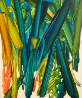 반복과 수행, 그리고 그것으로 만들어낸 촉지적 질감을 캔버스에 담아내는 것은 유정현(b.1973)의 작품과도 맞닿아 있다. 거침없이 화면에 엉켜 있는 붓질들은 그것이 겹쳐진 순서에 따라 일련의 서사성을 보이는데, 여기서 서사는 작가가 우연과 필연이 교차하는 지점을 포착해 내며 화면을 채워 나간 흔적이다. 물감을 머금은 붓은 작가가 화면에 가한 물리적인 힘에 따라 우연성을 담보하며 옅어지고 굵어지는가 하면, 진해지고 얇아진다. 최근 작가는 다양한 색상으로 화면을 실험하며, 종종 유연한 붓질의 흐름과 반대되는 자로 잰 듯한 수평의 기호를 삽입한다. 얼기설기 얽힌 흔적과 명확히 대비되는 깔끔하고 추상적인 ‘선’은 관람자가 녹색 계열의 화면에서 식물의 형상을 발견하고, 몰입하려는 욕구를 불쑥불쑥 방해하며 구상도, 추상도 아닌 경계의 지점을 충돌시키고 이중적인 감각을 형성해낸다.