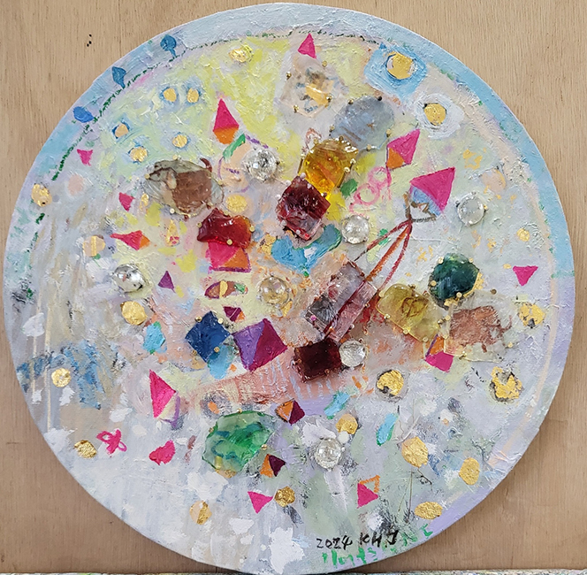 김형주(이멜다, 1947-), 작은 이의 꿈, 2024, 유화, 달드베르(색유리 )금박, D35cm