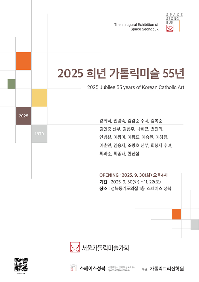 성북동 기도의 집에 새롭게 마련된 문화예술공간 ‘스페이스 성북’의 이 개관전시는 이러한 의미 속에서 준비되었으며, 한국가톨릭 미술 55주년을 함께 기념하는 자리입니다. 이는 단순히 과거를 회고하는 데 머무르지 않습니다. 하느님의 섭리 안에서 주어진 특별한 은총의 시간으로, 신앙과 예술이 걸어온 길을 되새기며 앞으로의 새로운 여정을 향해 나아가는 출발점이 되고자 합니다.