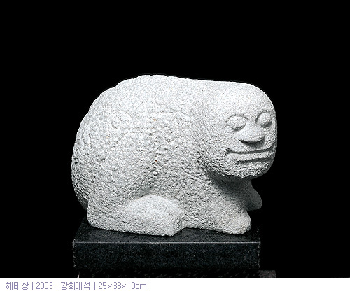 위풍당당하고 위압적인 맹수가 아니라 엉거주춤하고 다소 의기소침해 보이기조차한 이 해태상들은 민화에 빈번하게 등장하는 인간과 친숙한 범의 모습과 어딘지 닮아 있다. 이런 점들은 그의 평범하지 않는 외모에서 기대할 수 있는 세련됨에의 예측을 빗나가게 만드는 한편 그의 미적 관심이 소박성에 있음을 증명하는 자료이다. 그는 작은 크기로 재현된 해태상들을 바닥에 늘어 놓음으써 다다익선(多多益善)의 윤리를 일깨우려 하는지도 모른다. 아니면 어느면에서 다소 멍청해 보이지만 척사(斥邪)와 수호의 본분에 충실한 이 상상의 동물을 통해 우리의 심층무의식에 잠재된 보편적 믿음이자 삶의 지표인 권선징악(勸善懲惡)이나 수신(修身), 선량함의 가치를 되짚어 보고자 하는 것은 아닐까, 인간이 만들어 내는 온갖 재앙 앞에 전면적으로 노출된 우리 스스로에게 해태는 잃어버린 순수이기도 하다. 그는 그 순수의 실마리라도 잡기 위해 이 무수하게 많은 해태상 들을 만들고 있는 것은 아닐까.