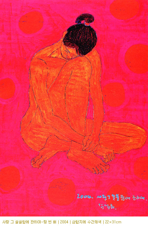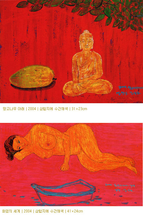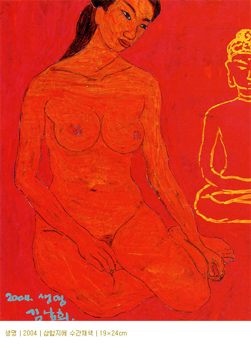 이제 한 단계 나아가 작가는 선을 긋고 또 그것을 깨는 작업을 시도한다. 푸르고 붉은 주황의 바탕 위에 그어진 파격의 선들은 곡선적인 이미지로 화면 속에 각인된 누드의 실루엣을 보다 강렬하게 받쳐주고 있다. 형상과 형상 없음, 즉 실(實 )과 허(虛)의 밀도에서 볼 때, 형상의 세계를 넘어서고자 하는 작가의 또다른 시도로도 읽혀진다. 이 또한 이념적인 측면에서 보자면, 그동안 불교적인 이미지에 갇혀있던 경직성을 풀어내고자 하는 의도도 내포되어 있는 듯하다. 요컨대 작가는 일관된 모티브를 천착하면서도 양식적인 면에서 나름의 변화를 추구하고 있음을 엿볼 수 있다.