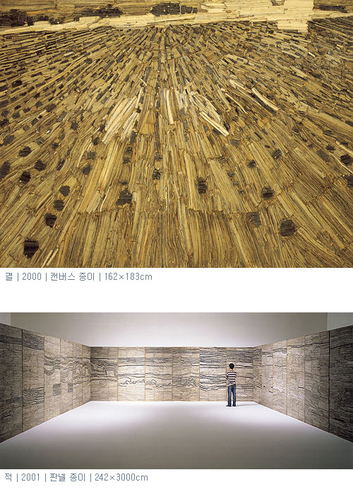 종이의 ‘결’ 과 ‘쌓음’ 종이는 외부환경이나 조건에 의해 쉽게 변형되는 단점도 있지만 그것이 또한 장점이 되기도 한다. 이러한 특성을 연구한 작가는 결과 색감, 그리고 가공의 방법이나 정도에 따라 종이의 성격이 전혀 달라진다는 사실을 깨닫고 여러 가지 기술적인 연구를 시도하게 된다.