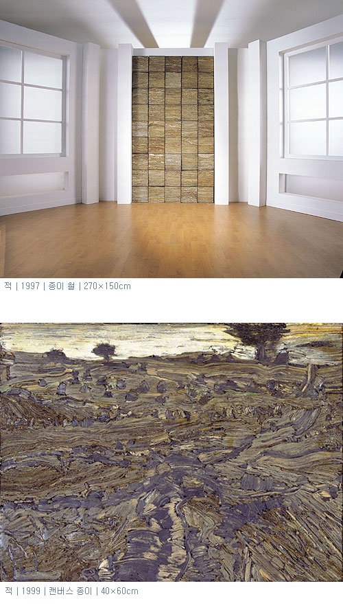 1998년도 <동아미술제> 수상작 <적 績> 역시 버려진 도화지와 신문지 등으로 이루어진 작품이다. 그는 이를 다시 접착제로 굳혀 가공한 다음 묵직한 철제 프레임에 고정시킨 오브제로 올려놓았다. 몇 개의 단순한 색채와 면의 분할로 이루어진 이 작품은 두꺼운 종이의 결과 결 사이에서 발생하는 리듬감이 주축이 되고 있다. 여기서 그는 하나의 형상을 담는다라기 보다는 종이라는 생 재료를 그대로 제시하고 있는 것처럼 보인다. 마치 대지에 볏단을 쌓아놓은 모습을 연상시키는 이 작품은 기하학적이고 추상적인 요소를 다분히 포함하고 있으나, 자연의 형태를 기본으로 한다는 점에서는 초기의 관심사가 그대로 이어짐을 알 수 있다. 이렇듯 비록 예전작업에 비해 형상이 매우 거칠게 다루어지고 있기는 하지만 여전히 그는 형상에 대한 굳건한 신뢰와 가치를 부여하고 있다. 그가 한동안 작품의 대상이 되는 자연을 분석적으로 바라보았다면 이제는 자연에 대한 통합적인 시각을 열어 보여주고 있다. 대지가 주는 마티에르는 종이의 결로 대체되었으며, 구체적인 사물은 단순한 기하학적 형태로 단순화 되고 있다는 사실은 이를 잘 반영하고 있다. 이러한 사물의 단순화라는 그의 관점은 향후 전개되는 작업과정과 긴밀히 연계되어 있어 더욱 흥미롭다.