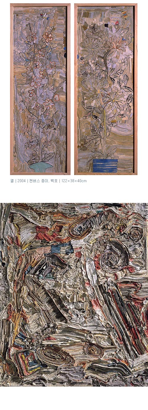 작품 <결2003>은 색채와 질감이 서로 상호작용하면서 상당한 일루젼 효과를 가져다주는 작품이다. 시지각적 유희를 가져다주는 이 종이의 단면은 마치 윌렘 드 쿠닝Willem De Kooning을 연상시키는데, 초기의 비교적 단순한 색조에서부터 출발한 종이기법은 이제는 다채로운 방식으로 전개되기에 이른 것이다. 가령, 색상이나 종이의 결이나 두께의 조절, 종이 표면의 가공의 정도나 수준이 보다 정교하게 변화되었다. 또한 종이의 질감과 양감, 그리고 리듬의 변화에 이르기까지 자유로운 표현이 더해져서 일종의 생동감, 생명력이 지배하는 회화공간으로 유도되고 있다.