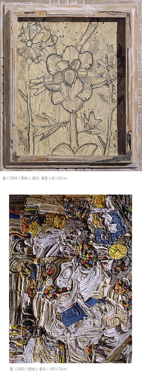 근래 들어 한국적 미감의 표현에 관심을 갖게 된 그는 ‘우연성’의 요소를 자신의 작업성향에 추가한다. <결 2004>은 종이와 함께 흙을 용해하여 굳혀 만든 작품이다. 이러한 경향의 작업들은 마치 전통 분청사기에서 드러나는 색채와도 닮아있다. 마치 백토나 황토에서 얻을 수 있는 고졸한 맛을 풍긴다.