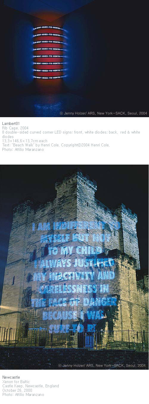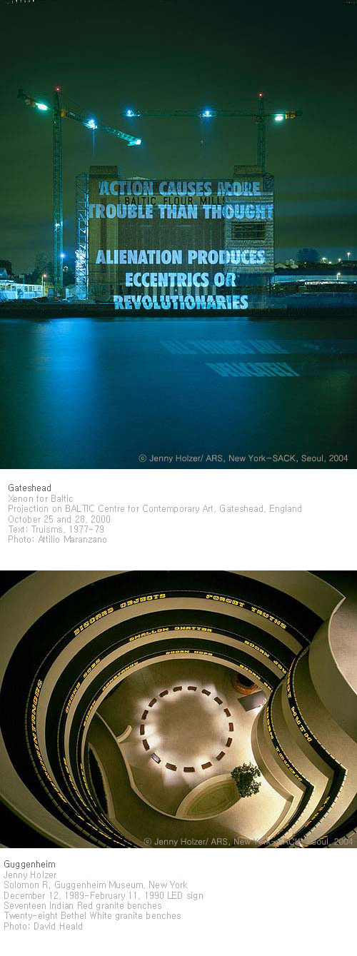 제니 홀처는 지난 25년 동안 베를린의 뉴 내셔날 갤러리, 레치타그 등의 건물, 그리고 뉴욕과 빌바오의 구겐하임 뮤지엄을 포함한 무수한 공공장소 및 국제 전시에서 신랄한 아이디어, 논쟁, 슬픔 등에 대해 보여주고 있다. 티셔츠, 명판, LED사인 등의 형태로 제작되어 보여주는 그녀의 작품의 매체는 글이며 필수적으로 공공의 차원에서 읽혀진다. 홀처는 뉴욕 시내 곳곳에 포스터를 부착하기 시작한 1970년대 후반부터 최근의 자연풍경 및 건물에 영사하는 제논(xenon) 프로젝션 작업까지 그녀는 무지와 폭력과 맞서는 유머, 친절함, 도덕적 용기 등에 대한 작업을 하고 있는 것이다.