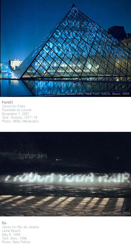 Holzer's practice includes installations with electronic LED displays that are attentive to architecture, monuments and memorials; and since 1996, large-scale xenon projections of text on buildings and landscape. She has realized projections in Florence, Rome, Venice, Rio de Janeiro, Buenos Aires, Oslo, Paris, Bordeaux, Berlin, Washington, New York City and Miami.