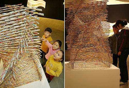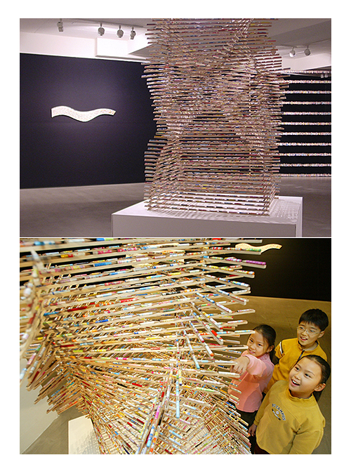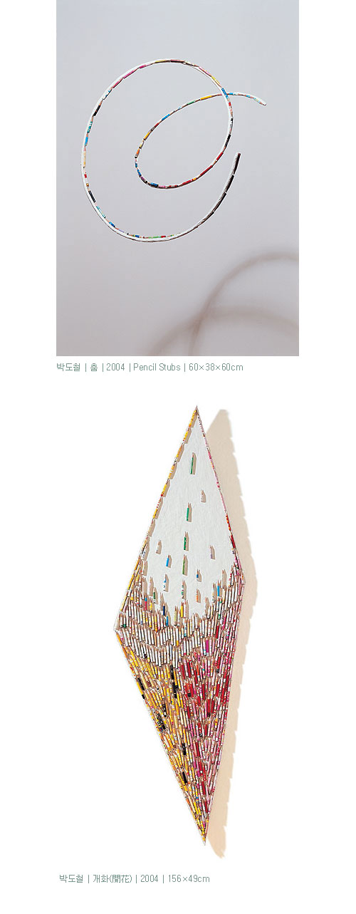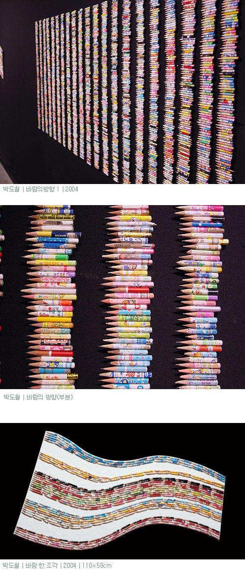 이번에 선보이는 연필 설치작업은 학생들이 실제 쓰다 버리는 몽당연필을 장기간에 걸쳐 수거한 것으로, 아이들의 순박함을 대변하고, 수정이 가능하다는 고유의 특성 때문에 친근감을 느끼게 한다. 그리고 일상세계에서 분리된 이 재활용 되어진 연필은 지각자로 하여금 그 본래의 환경에서 이탈된 오브제로 비춰지게 한다. 그는 그림이나 학습의 도구로 기능해야 하는, 즉 응당 그 용도에 걸맞는 위치에 있어야 하는 연필들을 일상 밖으로 끄집어내어 지각의 대상으로, 사유의 대상으로서의 생명력을 불어 넣은 것이다.