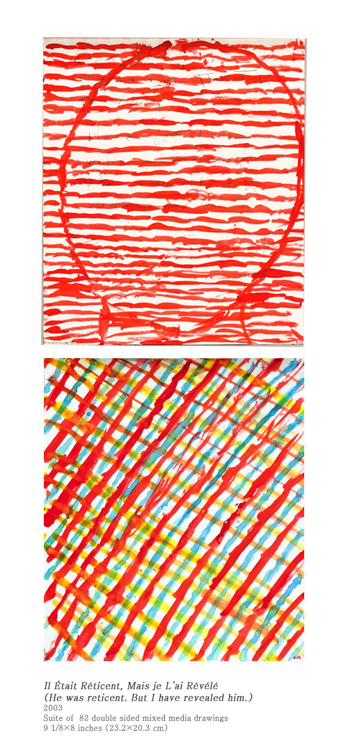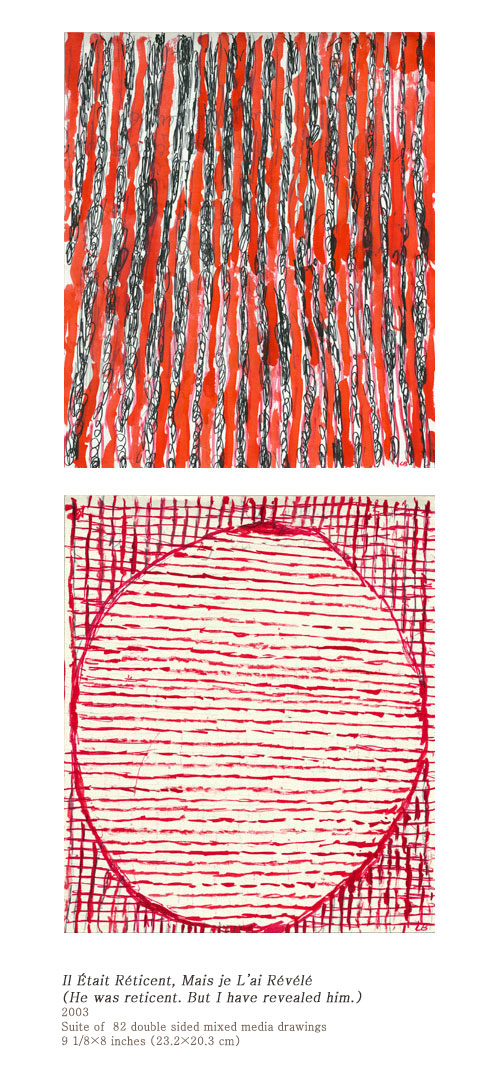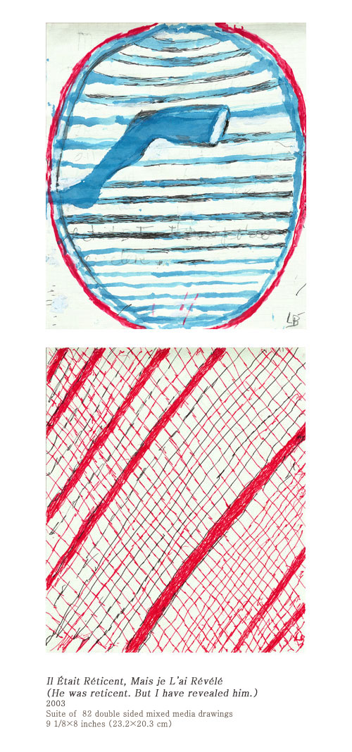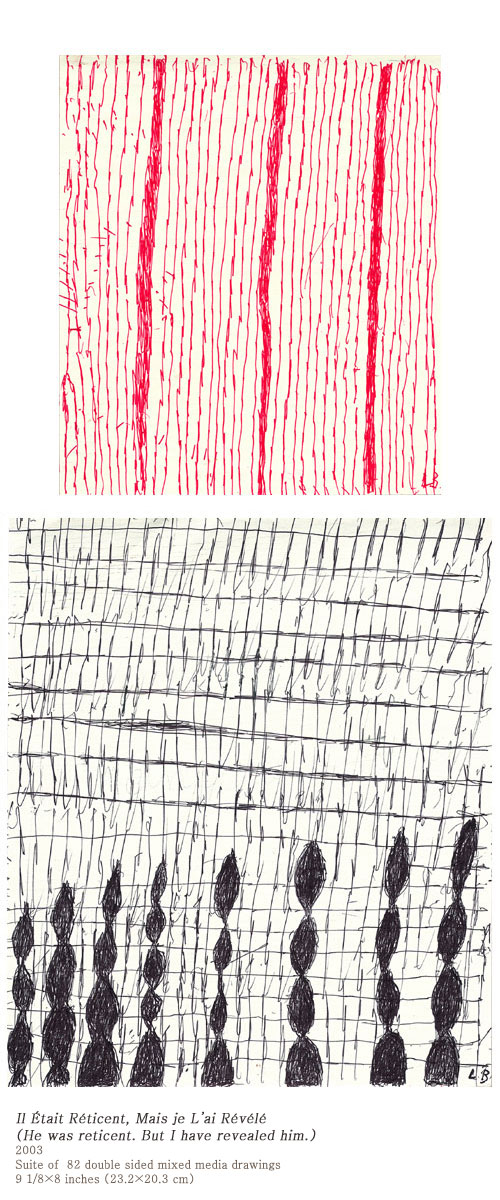 그녀의 작업은 추상에 가까운 기둥 형태의 인물상에서, 신체의 부분이나 성적인 이미지를 에로틱한 형상으로 표현한 조각, 대형 거미 형상을 띤 압도적인 브론즈 작업, 손바느질한 천 조각에 이르기까지 다양하다. 국제 갤러리의 이번 전시에는 작가가 지난 2년 동안 주력해 온 드로잉 작업들이 다수 출품되는데, 부르주아에게 드로잉은 매우 특별한 의미를 지닌다. 드로잉은 예술에 입문하기 훨씬 전, 집안 사업을 돕기 위해 융단 무늬의 도안을 그리던 어린 시절부터 익혀 왔던 것으로 그녀는 언제나 손에 닿는 대로 모든 도구와 화면을 이용하여 드로잉을 했다. 이러한 드로잉은 두려움을 없애주었으며 특히 잠 안아오는 밤에 그녀를 위로하고 치유하는 역할을 했다. 실제로 그녀는 “예술의 목적은 두려움을 정복하기 위한 것, 그 이상도 이하도 아니다.”라고 말한 바 있다. 격자무늬와 원, 평행선이 끊임없이 되풀이되는 그녀의 드로잉들을 보면 무의식에 잠재된 과거의 기억과 두려움을 손끝으로 끄집어 내어 종이에 옮기는 반복적인 행위를 통해 마음의 안정을 찾아가는 과정이 그대로 드러나는 듯하다. 이러한 드로잉들은 시간의 흐름에 따라 변화하는 감정의 리듬을 기록하는 새로운 형태의 일기장 역할을 하기도 한다.