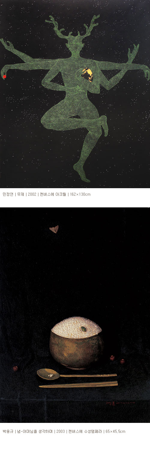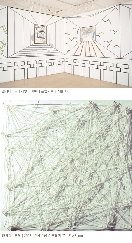 김제나의 테이프 작업 속의 공간은 3차원 공간에 대한 끊임없는 탐색으로 빚어낸 공간이다. 공간에 대한 다양한 시각들을 포착하고 그 공간에서 느껴지는 딱딱함과 질서, 그러면서도 자유로우면서도 맹렬한 측면을 기하학적인 형태와 선으로 표현하였다. 폭포가 하나의 물방울이 모여 이루어진 것이듯 하나의 점처럼 가장 작은 단위가 궁극적으로는 모든 만물의 기본임을 아크릴로 이미지화한 민정연은 캔버스 위에 셀 수 없는 작은 점들을 축적해서 가장 큰 단위인 우주적 풍경을 상징적으로 표현하였다. 박웅규는 계란 노른자를 이용한 ‘템페라’라는 재료를 사용하여 생활주변의 인물이나 사물을 사실 그대로 표현하는 리얼리즘 계열의 작가다. 이번 전시에는 동양적 세계관이 기독교 사상보다 더욱 포용적이라는 판단 아래 유, 불, 선 사상이 담긴 그림을 그렸다.