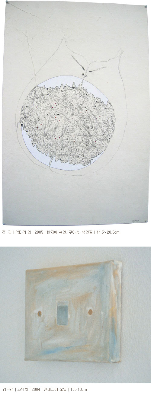 양희성은 오랜 시간을 두고 캔버스에 아크릴로 층을 입혀 누에고치가 실을 짜내듯 실을 끌어내 이미지를 만들어 내는 작업을 했다. 시간, 정성, 인내는 고전 풍의 화이트와 정교한 뜨개질에 의한 구성을 통해 발현되었다. 전경은 지극히 개인적인 삶에 직면하면서 드러나는 즐거운 감정, 어두운 감정 혹은 혼합된 감정을 드로잉을 통해 동화적이면서 서사적으로 표현하였다. 이 같은 감정은 작품 속 인물들의 모습과 행동에서 나타나는 과장, 변형을 통해 극명하게 나타난다. 정석희는 외국에서 사는 이방인으로서 느끼는 삶의 무게와 자신의 존재감을 사진과 회화를 결합한 이미지와 비디오 영상을 병치시켜 표현하였다. 외국생활의 평범한 일상을 담은 영상 풍경과 그 생활 속에서의 작가의 귀소본능에 관한 회화적 이미지가 서로 반향을 일으킨다.