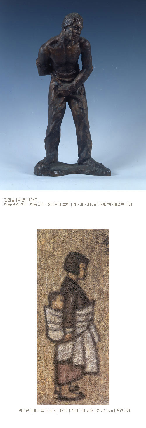 1953-1959 : V. 냉전의 그늘 1953년 8월 15일 정부의 서울 환도로 3년에 걸친 전쟁은 휴전되었고, 남한의 이승만 반공체제와 북한 공산체제의 대치로 냉전 체제가 고착되어갔다. 전후 폐허의 한복판에서도 재건의 의욕은 다시 일어났다. “관전과 민전”에서는 이러한 재건의 의지가 대한민국미술전람회를 통해 제도권 미술로 자리 잡게 되는 상황이 그 밖의 단체전 참여 작가들의 작품과 함께 전개된다. “세계 속으로”에서는 창작과 표현의 자유를 꿈꾸며 세계를 향해 눈을 돌린 작가들의 작품 경향을 살필 수 있다.