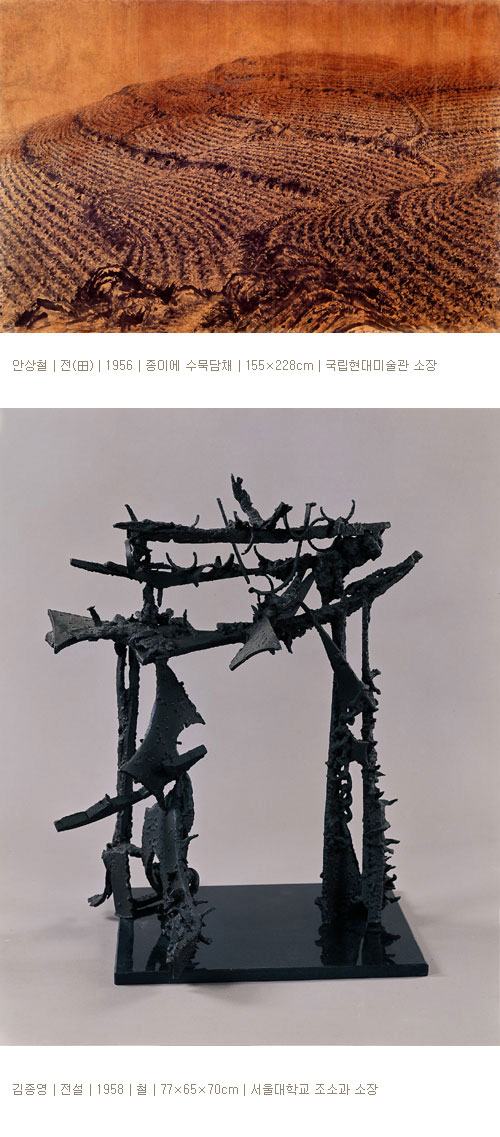 1. 관전과 민전 대한민국미술전람회는 전후 미술계 최대의 행사였다. 국전 초기에는 전후의 재건 의지를 살려 새로운 경향의 미술을 수용하려는 진취성도 있었으나 1950년대 중반을 넘어가면서 불공정 심사 문제, 국전을 둘러싼 힘의 분배 문제로 끊임없는 잡음이 일어났다. 국전이 자연주의 계열의 보수적 인사들에 의해 독점되어가자 1950년대 후반에 이르면 이에 반하는 단체들이 결성되었다. 모던아트협회, 현대미술가협회, 창작미술가협회, 신조형파 등의 단체들은 창조와 조형 정신의 회복을 강조하면서 제도권 미술 일변도의 화단에 변화를 꾀하였다.