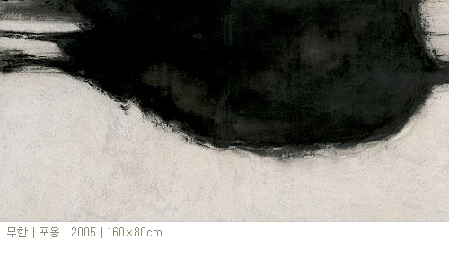 먹의 검은 색이 지닌 풍부함 엮시 적극 활용하면서 대리석 가루를 섞어 사용하는 석채(石 彩)방식을 현대적으로 해석하는 영리함도 보이고 있다.