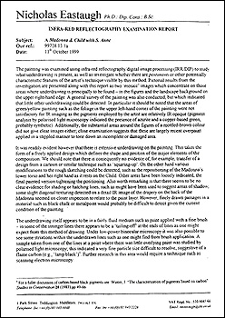 그러나 그림의 상당부분 밑그림이 있다는 것은 명백하다. 형태와 주요 구성 요소들을 배치를 결정하는 자유롭게 적용된 디자인 형식을 따른다. 예를 들어 squaring-up 따위의 비슷한 기술이나 카툰(실물크기의 밑그림)으로부터 디자인이 이전되어 왔다는 증거는 결과적으로 하나도 없다는 것을 우리는 짚고 넘어가야 한다. 다시 말해서 여러가지 거친 스케칭에서 여러가지 수정작업이 된 것을 감지될 수 있다는 것이다. 성모의 낮은 토르소(나체흉상)와 그녀의 오른쪽 손이 어린 아이 위에 놓여 있는 것처럼 재배치되듯 말이다. 다른 부분은 위치가 확고하게 자리매김되어 색칠해진 마지막 버전도 불명확하다. 또한 그림자와 대각선으로 살짝 텍스처리된 부분을 나타내는데 사용되었을지도 모르는 쉐이딩과 해칭한 선에 대한 분명한 증거는 없다는 것에 주목할 가치가 있다. 이것은 물감 층과 관련한 정밀조사에서 나타날 법한 성모의 등에 피륙의 주름이 상세한 IR이미지가 감지되었다. 그러나 주어진 그림의 현재상태에서는 검정 초크나 메탈포인트와 같은 물질로 정밀하게 그려진 구절들은 아마도 감지되기 어려울 것이다.