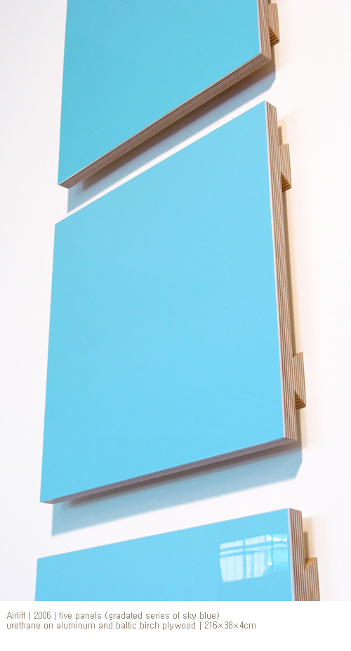 지난 12월, 나는 다가올 더 컬럼스 아트센터 전시회를 위해 패널들을 구성하기 시작했고 3월에 첫 “혼합”을 완성했다. 결과는 놀라웠다. 우선, 나는 위에 올라가는 처음 세가지 색을 선정하는 일에 많은 어려움을 겪었는데 그 과정 속에서 어느 색을 조합해도 늘 흥미로운 결과를 얻어낼 수 있다는 확신을 얻게 되었다. 하지만 곧 나는 본질적으로 많은 차이를 안고 있는 색을 조합하게 되면 전체적으로 패치워크 같은 느낌을 주게 되고 이는 하나의 통일된 작품으로 감상되지 못한다는 사실을 알게 되었다. 또 나는 혼합 과정에서 요구되었던 정교함과 치밀함에 놀라지 않을 수 없었다. 개별적 패널 하나 하나의 색채에는 상당한 집중력이 요구되었지만 완성된 여섯 개의 패널들은 특별한 배치 방법 없이도 서로 너무 쉽게 잘 어우러졌기 때문이다. 하지만 이보다 더욱 놀라웠던 것은 어느새 “내가 페인팅을 하고 있었다!”라는 사실이었다. 페인팅에 조각 같은 입체감을 시도하기 시작하면서 내가 페인팅의 영역에서 느낄 수 있는 개념이고 미적인 가능성들을 상실했었다는 사실을 깨닫게 되었다. “혼합”을 통해서 나는 회화가 지니는 시적이라고 할까, 잔잔한 이야기 같은 느낌을 새로이 발견하게 되었고 그것은 너무나도 자연스러웠다. 다음의 세 페인팅들은 하늘에서 떨어져 나온듯하다. 하나 하나 모두 지금 막 나의 옛 친구를 다시 만났다는 것을 알려주기라도 하듯이……