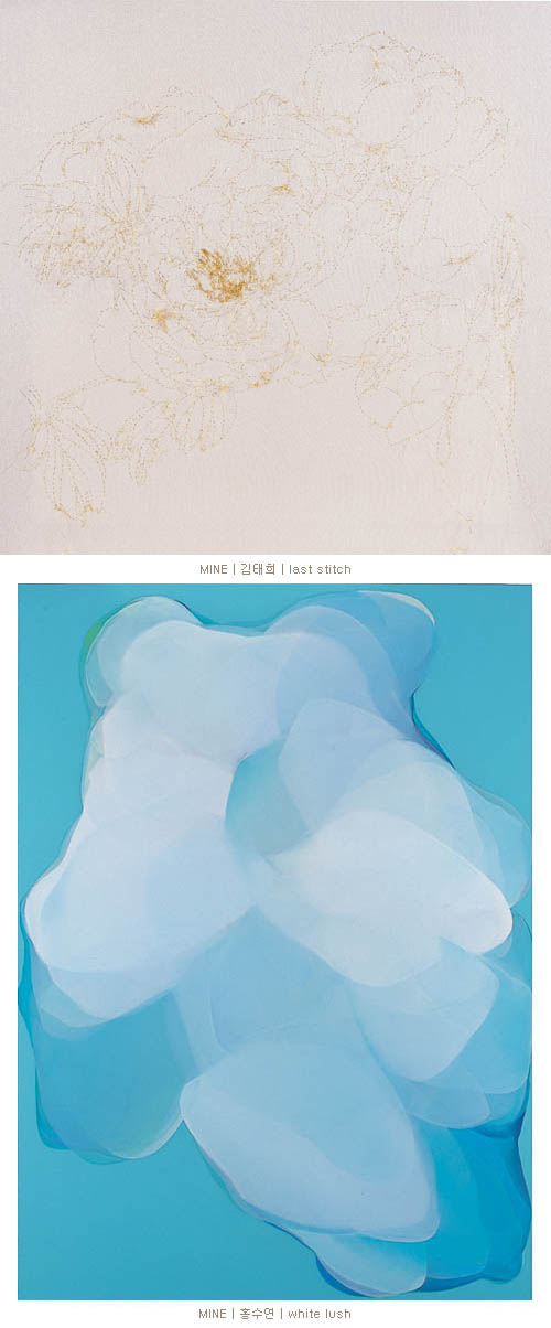 바늘과 실로 한국화를 현대적으로 해석하는 작업을 해온 김태희는 마인의 신상품 의상에 사용된 세련된 패브릭 위에 바늘땀으로 꽃을 그려 공예와 회화, 추상과 구상이 하나가 되는 독창적인 화면을 만들어 냅니다.