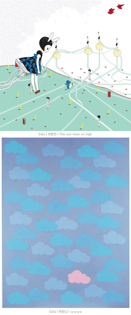 "YOUNG ARTIST WITH SJSJ"의 전시실에는 강현선, 박미나, 이현진의 작품을 통해 영 캐릭터 캐주얼 컨셉의 SJSJ의 이미지가 젊은 컬러감과 자유로운 감성으로 표현됩니다.