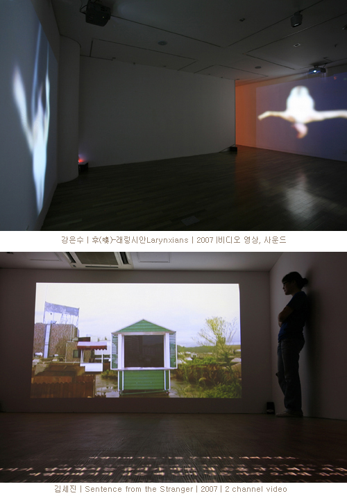 소리와 향기는 모두 비물질적 매체로, 모두 공기를 가로질러 투사된다는 점에서 유사하다. 강은수의 <후(嗅)-래링시안Larynxians>은 이러한 소리와 향기의 공감각적 영역을 모색한 영상 사운드 작업이다. 그의 작품에서 소리와 영상의 투사는 향기의 투사를 연상시키며 시각과 청각, 후각의 가로지르기를 실현한다. 한쪽 벽면에는 무용수의 춤추는 이미지에서 출발한 일종의 사이보그 생명체 래링시안의 영상 이미지가 투사된다. 이 영상은 거대한 바람이 지나가는 소리와 함께 반대편 벽에 반영된다. 관객은 자신의 피부를 스치며 지나가는 진동하는 소리(聽)와, 마치 향을 피워 올린 듯한 래링시안의 미세한 영상 움직임(視)에서 코끝을 자극하는 냄새(嗅)의 감각을 일깨운다.