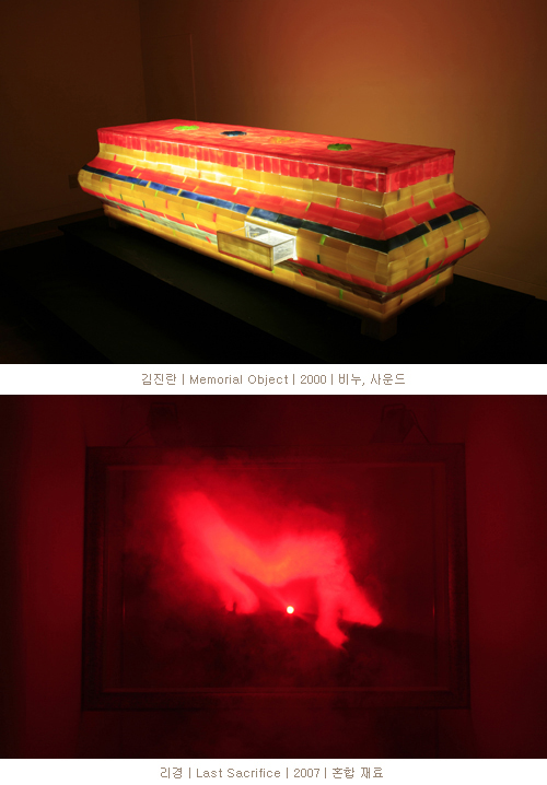 리경의 작품은 구약시대 인들이 가장 정결하고 향기로운 어린양과 같은 동물을 번제하여 그 연기 신호를 신에게 올려 보냄으로써 죄 사함을 기원하였다는 고대 후각의식에서 출발한다. 신은 그 연기를 흠향(歆香)함으로 기뻐하고 인간을 속죄하였다는 것이다. 속죄를 위한 이러한 향 공양은 신약시대로 넘어오며 예수라는 존재로 대체된다. 길이 15미터 높이 8미터의 고대 신당과 같은 공간을 점유하는 리경의 작품에서 한줄기 붉은 빛이 거대한 액자에 투사되는데, 액자 양 옆으로 수초 동안 연기가 뿜어지면서 빛 사이로 드러나는 것은 바로 미켈란젤로가 보여주었던 예수의 피에타상이다. 정결한 동물의 죽음을 통한 훈향과 속죄는 성체(聖體)의 죽음으로 대체되었음을 시사하고, 연기와 향기의 있음으로 존재한 신의 현존은 연기의 사라짐과 동시에 부재하게 된다. 황홀경에 가까운 상태로 고대 종교의 훈향 의식을 가상으로 체험하게 하는 그녀의 작품은 후각적 차원에 신성이 개입될 수 있음을 일깨운다.