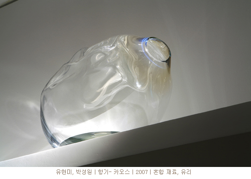 유현미는 조향사와의 협업으로 여러 종류의 향기가 혼성된 일명 ‘카오스’ 향기를 제조하고, 그 느낌을 시적 언어로 번안한 후 향기가 공간에 스며들 듯 시적 텍스트들을 전시장 벽면에 채운다. 향기에 대한 유현미의 시적 타이포를 배경으로 박상원의 환상적인 향수병 유리 오브제가 전시장 곳곳에 놓여진다. 병 속에 담겨져 공기 속에 침투하는 향수 ‘카오스’는 열려진 판도라의 상자를 통해 나오듯, 열정, 욕망, 아름다움, 슬픔 등이 교차된 감정을 불러일으키며 관객의 신체를 묘하게 에워싼다.