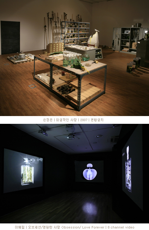 손정은은 공간 설치작업 <외설적인 사랑(Pornographic Love)>에서 여성이 풍기는 냄새에 접근한다. 작가는 여성의 냄새를 강박적으로 수집하여 저장하는 누군가의 방을 제시한다. 그가 유리병들 속에 감금시킨 향기의 소스들은 생선과 꽃, 달걀과 조개, 새 등 여성성을 고양시키는 마술과도 같은 물질들로 모두 여성의 내부를 연상시킨다. 죽은 꽃과 결합한 생선, 타원형의 알과 조개, 축축한 뼈에서 촉발되는 것은 비릿하면서도 향기로운 여성기의 냄새, 젖가슴의 냄새, 월경혈, 피와 땀, 날것의 육신의 냄새이다. 욕망의 대상과도 같은 이들 온갖 물질들은 모호하고 신비로우면서도 섬뜩하다. 작가가 수집한 유혹의 냄새들은 그 치명성을 원천봉쇄라도 하듯 모두 병속에 철저하게 감금되고 은폐되었다. 그러나 묶임과 박제, 밀폐와 봉인이라는 극단적인 금욕의 장치는 역설적이게도 사도 마조히즘의 심리드라마를 상기시키며 외설적인 상상력을 불러일으킨다. 여성의 육체에 성스러움과 비천함이 공존하듯이 성과 속, 숭고와 외설의 양가적 가치를 지니며 고정된 체계에 균열을 만들어내는 여성성의 특질을 공유한다. 작가가 제시한 여성성의 은유와 그 냄새들은 의미화 할 수 없는 모호한 영역에 속하여 불안하고 위협적이기도 한 냄새의 가치와 만난다.