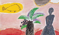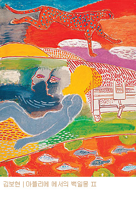 제 3장 ‘고통과 환희의 변주곡’에서 작가는 80년대를 지나며 자신이 살아온 삶 전체를 포용하는 작업의 세계로 나아간다. 대형의 화면에 포진한 인물, 동물, 식물들을 통해 김보현이 그려내는 세계는 인생의 환희와 고통 모두를 드러내고 있다. 즉, 기나긴 열정의 시간과 관조의 시간을 지나 이제 김보현은 우리의 삶이 고통과 즐거움, 고난과 환희의 또 다른 이름임을 조용히 알려주고 있는 것이라 해도 좋을 듯하다.