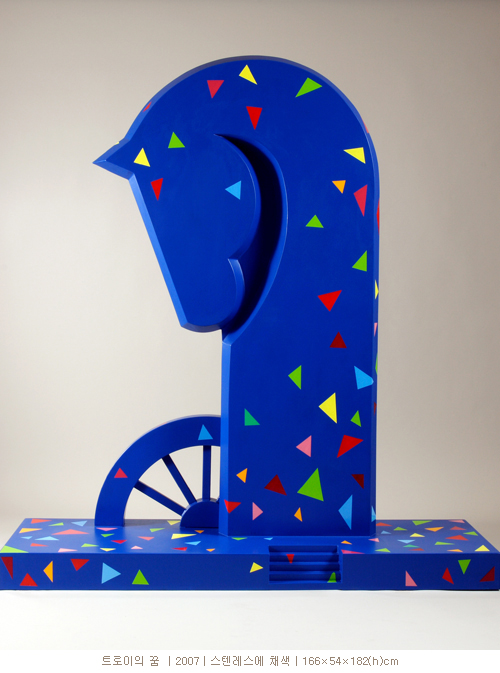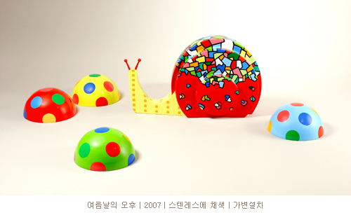 그에게 조각은 심오한 물성의 배치나 재료의 해석이기 이전에 누구나 쉽게 보고 즐기고 주변 환경 속에 스스럼없이 들어가 관객들의 몸과 함께 하나가 되어 일체가 되는 그런 조각의 세계, 일상과 조각의 경계가 순간 무화되는 그런 풍경을 꿈꾸고 있어 보인다.
