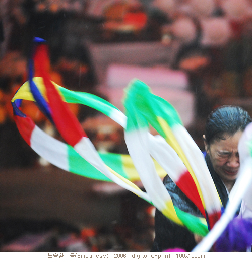 그녀가 하늘을 향해 힘차게 내뻗은 오방색 천이 허공을 휘익 휘젓고 돌아온다. 그녀의 신을 위무(慰撫)하는 것이 그녀의 임무다. 그녀의 기구한 현세의 팔자 혹은 운명은 그녀를 무당으로 내몰았다. 그 운명은 거부할 수도 없었다. 그렇다고 선택할 수 있는 것도 아니었다. 희랍신화의 시지프스(Sisyphus)의 운명 같은 그녀의 운명은 고래의 뱃속에 삼켜졌다가 살아난 구약성경의 요나(Jonah)에도 비할 바 없이 가혹하다. 그럼에도 불구하고 춤추는(舞) 그녀는 비워지지 않는 자신을 비워야(無)한다. 그래서 작가는 하늘을 향해 내던진 오방색 천의 다이내믹을 사진의 중심에 두고, 슬픈 운명의 무당얼굴을 슬그머니 오른 쪽 구석으로 밀어낸다.