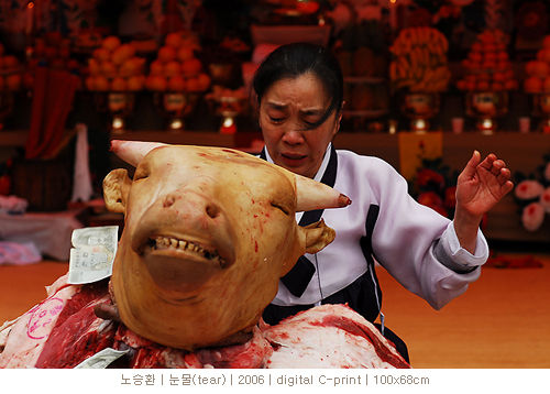 피는 붉다. 피는 생명이다. 영원함이다. 강함이다. 근원적 에너지인 붉은 태양을 닮았다. 희생제물(Scape goat)로 오른 황소는 선혈(鮮血)이 낭자하다. 소의 피를 먹는 무당의 얼굴도 붉다. 그녀가 흘리는 눈물방울조차 붉어 보인다. 무당은 하늘에 제물로 바친 황소의 피를 먹음으로써 천지신명에게 대신 죄사함을 받아내려는 것일까?