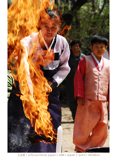 무당이 지핀 불꽃이 이글거리며 타오른다. 불꽃도 붉다. 하늘에 제사할 희생제물을 삶고 요리하던 그 불꽃이 이제는 하늘로 훨훨 날아오른다. 이 한 많은 이승을 떠나 광명(光明)한 저 세상으로 간다. 불꽃은 제물 하나하나에 담긴 메시지를 무당을 대신하여 저 세상에 오롯이 전할 것처럼 타오른다. 그 메시지는 무당의 굿거리에 의하여 이미 정화(淨化)되었을 것이다. 이를 방증(傍證)이라도 하듯 작가의 앵글은 불꽃을 태우는 무당의 옆에 서있는 천진난만(天眞爛漫)한 어린 소년을 놓치지 않는다.