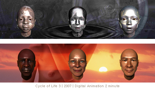 이번 전시에서 보여주는 신상호의 애니메이션작품 <Cycle of Life 3>은 실사이미지의 배경과 디지털로 만든 이미지의 형상으로 구성된다. 흑인, 백인, 아시아인으로 구성된 3명의 인간 이미지는 어린아이에서 노인으로 변해가면서 빠른 속도로 진행되고 있는 도시 단면들의 배경 이미지들과 대비되어 형태적인 우월성을 가지고 관객에게 하나의 드라마처럼 보여진다. 특히 드라마를 구성하기 위해 작가는 미술의 역사에서 가장 보편적인 주제중의 하나인 '삶의 순환' 이라는 주제를 도입한다─작가는 삶의 순환(the circle of life)을 삶의 주기(cycle of life)로 해석한다. 작가는 우리 인간 삶의 진행 혹은 순환과 환경 변화의 속도를 일차적인 차원에서 병렬시켜 놓았다. 이것을 통해 우리는 그의 작품에서 이차적인 주제인 삶의 무상함(vanitas)을 유추할 수 있다. 인간의 탄생과 소멸과는 관계없이 이 세상에서 많은 것들이 커다란 변화 없이 우주적인 질서 속에서 기능한다는 의미를 생각해볼 수 있을 것이다─이 작품을 통해 그의 예술이 근대적인 유기체적 세계관을 뛰어넘어 정보적인 세계관으로 전이되어 있다는 것을 알 수 있다. 그러나 사이클이라는 제목은 지속적으로 어떤 인식론적인 사유를 요구한다. 그 인식론적인 사유의 근거는 거시적으로는 사회적 구조와 경향성의 변화, 미시적으로는 개인적 의식의 변화와 관련되어 있다.