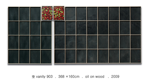 그는 이를 보다 실제적이고 논리적이면서도 현대적으로 해석할 수 있는 방법을 모색하게 된다. 따라서 기존의 오브제, 즉 전통적인 생활기물을 화판으로 활용하는 대신에 그와 같은 형식에 합당한 화판을 직접 제작하기에 이른다. 목공작업을 필요로 하는 새로운 형태의 화판은 나무라는 재질을 이용하여 직접 만들되, 일관된 작품 명제인 <空공>이라는 조형개념을 충족시킬 수 있는 형태가 된다. 나무소반이나 나무상자의 이미지를 현대적인 조형개념으로 재해석하여 기하학적인 인위적인 구조물로 변환하는 것이다. 그림의 소재가 놓이는 곳, 즉 화판은 무엇을 담을 수 있는 그릇 또는 상자로서의 입체적인 공간이 된다. 그 안에 소재의 이미지가 들어감으로써 시각적으로는 의심할 수 없는 입체적인 공간이 되는 것이다.