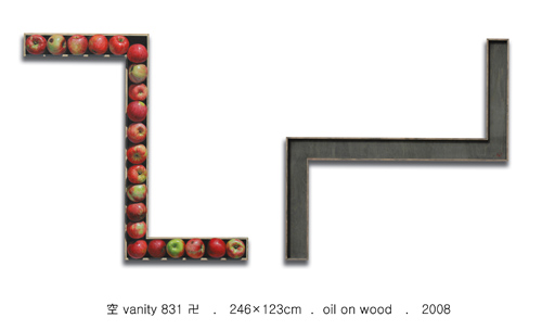 그에 의해 새로운 존재가치를 얻게 된 사과는 더 이상 아름다운 정물의 소재에 머물지 않는다. 조형적인 관념의 세계를 탐조하는 여행의 동반자가 되고 있다. 그렇다. 사과라는 소재의 여행은 이제 자의적인 조형공간, 즉 기하학적인 구조물로 이루어진 나무화판과의 다양한 변주를 통해 그 때마다 존재방식을 달리하면서 현대미술 그 중심으로 이동하고 있다.