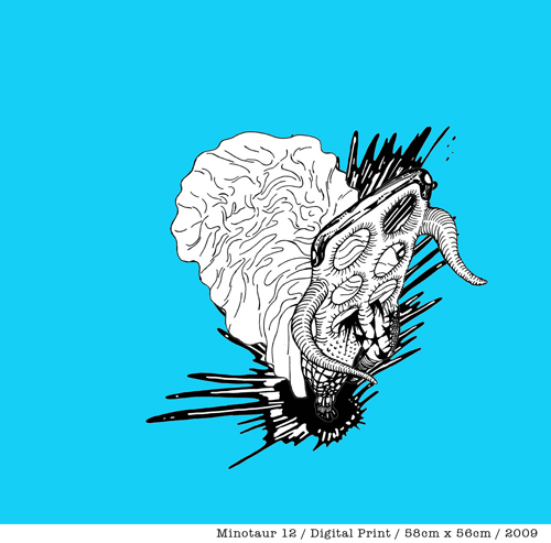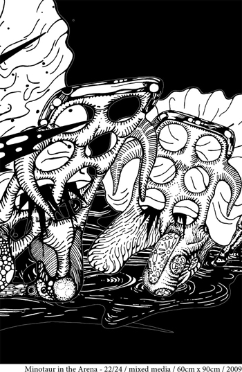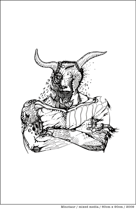 이제 사실을 털어놓을 때가 된 것 같다. 이 전시는 미노타우로스나 투우에 관한 것이 아니다. 그리스 신화도 다이달로스도 관계없다. 언제부턴가 나는 내가 무엇을 그리는지도 모르고, 그저 선을 긋고 점을 찍는 내 손을 멍하니 바라볼 뿐이었다. 바라보면서 생각한다. 나는 도대체 뭘 그리고 있는 건가? 달리 이름 붙여 부를 말이 없어서 처음에 그리려고 작정한 것들의 이름을 - 미노타우로스니 뭐니 해가며 그리고는 있지만 - 누군가 정색을 하고 물어보면 마땅히 할 말이 없다.