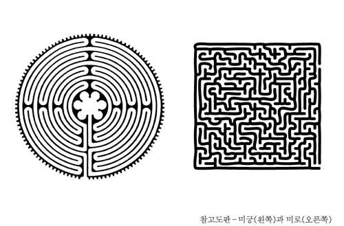 미노타우로스는 잘 알려진 대로 소의 머리를 가진 사람. 괴물이다. 황소로 변한 제우스와 에우로파 사이에서 난 미노스의 아들이자, 바다에서 온 흰 숫소와 파시파에와의 사이에서 난 괴물이 미노타우로스다. 오래 생각하지 않더라도 이 괴물은 힘, 관능 등의 욕망을 상징한다. 이 괴물이 있는 곳이 미궁이다. 미궁을 사전에서 찾아보면 “밖으로 나가는 문을 찾을 수 없도록 길[通路]이 만들어진 건물로, 그리스의 전설에 나오는 '라비린토스'가 그 기원인데, 동물이나 인간의 학습 능력을 실험하는 데 사용되고 있다” 고 한다. 미궁의 기원이라는 라비린토스가 어떻게 생겼는지 궁금해서 자료를 찾아보다 새로운 사실을 알게 되었다. 라비린토스에서는 길을 잃으려야 잃을 수가 없는 것이다!