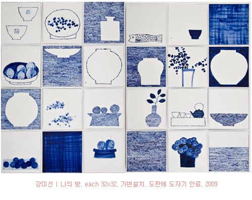 참여작가 중 가장 막내인 이에스더는 7개의 마요네즈, 수퍼글루와 함께 어딘지 우스워 보이고, 요란하고 장난끼 많은 커다란 얼굴들을 설치하여 추억으로 충만한 유년의 그리움을 기념비적으로 만든다. 이에 반해 강미선은 하얀 도편(도자기)위에 코발트안료로 포도나 茶, 꽃을 그려 한 벽면을 가득 채운 60여 점 작품 <나의 방>으로 오랜 친구에게 풍성한 위로를 보낸다.