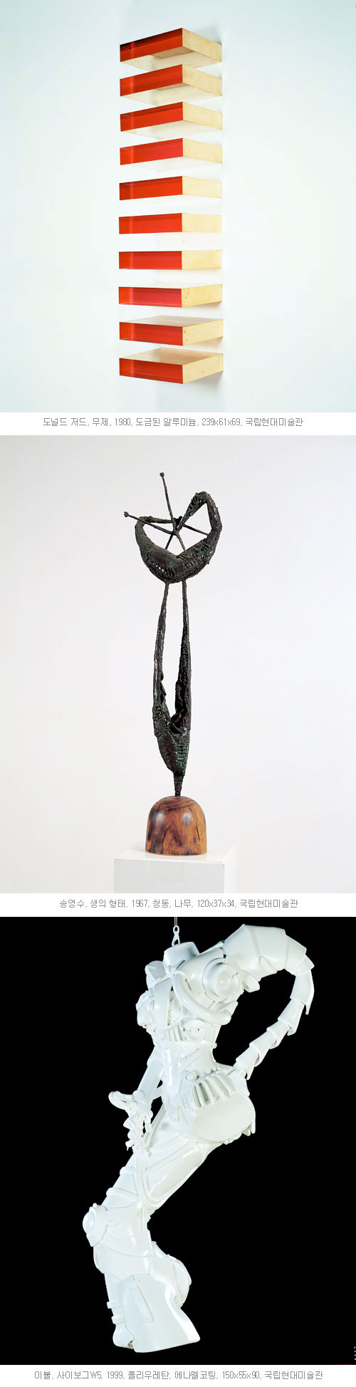 컬렉션, 미술관을 말하다_조각 / 제3전시실 한국 근대조각의 선각자들은 일제의 강점과 광복, 전쟁과 분단이라는 격동의 반세기를 거치면서 새로운 예술 경향을 습득하고 한국적 정서와 체질이 투영된 독자적인 조소(彫塑)예술의 확립을 모색하였다. 1950년대 이전, 일본을 통해 습득된 양식화된 사실주의 형식의 제한된 틀을 벗어나지 못했던 한국현대조각은 1950년대 말 전후(戰後)의 혼란기 속에서 새로운 전기를 맞이한다. 1940년 말 설립된 국내미술대학 출신 조각가들의 활동과 서구에서 활발히 시도되었던 용접 기법의 확산은 구축 적이며, 표현적인 형식 실험의 가능성을 넓혀주었다. 1960-70년대는 다양한 추상조각의 실험이 활성화된 시기였다. 격렬한 앵포르멜 추상조각, 재료의 특성을 최대한 드러낸 유기적 형태의 조각, 규칙적이며, 기하학적인 미니멀 조각 등 풍부한 표현의 확장이 이루어졌다. 한국현대조각은 1980년대 후반 다양한 매체 실험과 공간에 대한 관심을 보여준 설치조각의 확산, 1990년대 이후 포스트모더니즘 경향이 반영된 장르 파괴와 혼용, 컴퓨터, 비디오 등의 첨단 테크놀로지를 활용한 설치 등 다양한 모습으로 변모하고 있다.