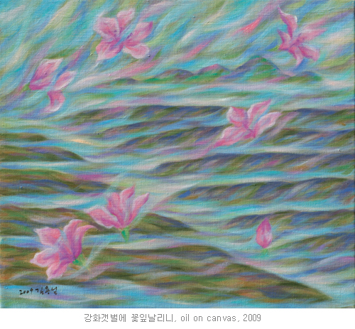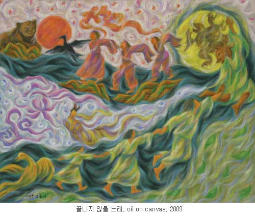 강화 바닷가 마을에서 살면서, 노을과 갯벌, 마리산의 신화에서 얻은 영감을 향가와 고구려 벽화, 민화의 세계관과 결합시켜 보기도 하면서 작가나름의 신화로 발전시켜 보았다.