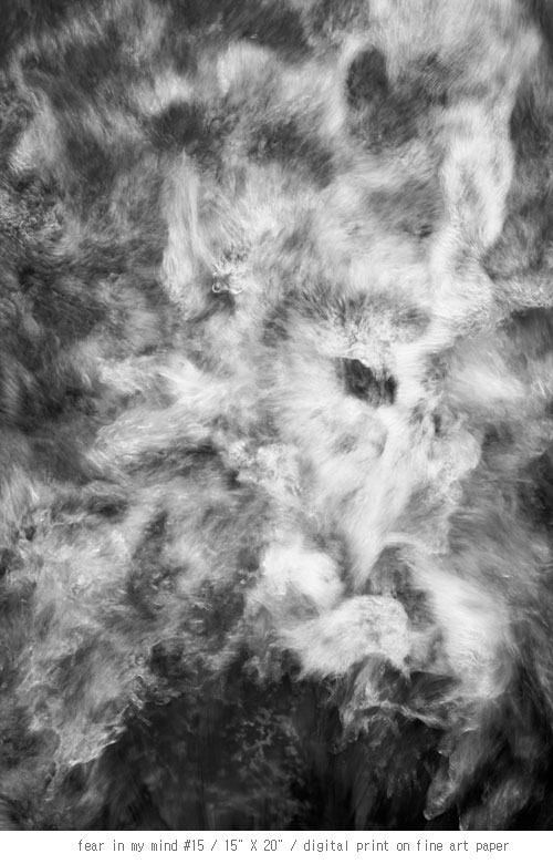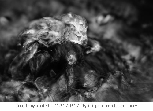 두려움의 형태-물로 그린 심상, fear in my mind사진 속 형상이 ‘물’이라는 사실을 어렴풋이 파악한 우리는, 조금은 단도직입적으로 들리는 제목 fear in my mind 을 보며 퍼뜩 생각할지도 모른다. 아쿠아포비아(aquaphobia). 그렇지만 ‘물’과 ‘내 마음 속 두려움’이 아무리 즉각적으로 연결된다 할지라도 이 사진들을 그저 ‘물 공포증’으로 읽어낸다면 너무나 뻔하고 안이한 접근이겠다. 박종성에 의하면 전시장에 불려온 ‘물들’은 Black & White Magazine의 포트폴리오 공모 선정작을 중심으로 이미지의 중복을 피하고 전체적인 밸런스를 고려해서 골라진 것이라고 한다. 그리고 3년 가량 “일정한 형태가 없지만 끊임없이 변화하는 물의 속성, 그리고 거기서 느껴지는 막연한 두려움에 주목하면서 물을 찍어왔다”고 했다.