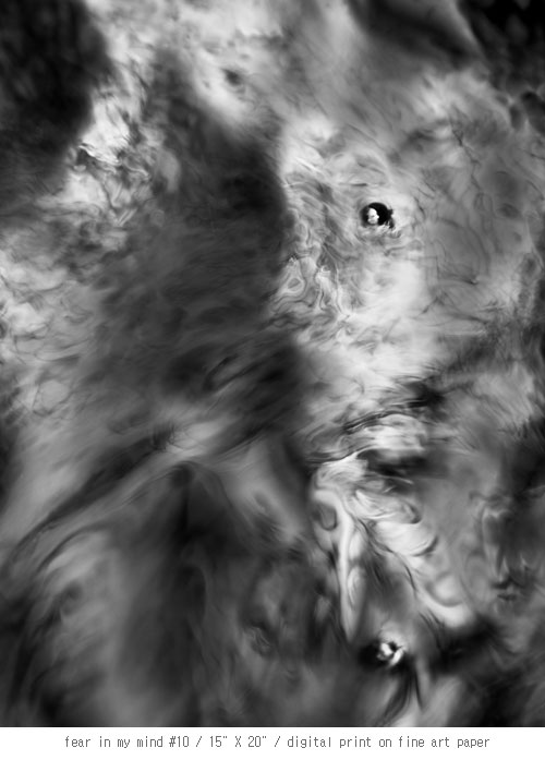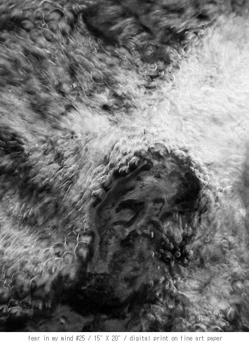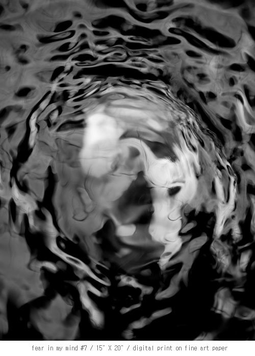 이 사진들에겐 정적인 두려움을 표현하려면 굳이 신경을 덜 써도 될 어떤 질감이, 그렇게 부여된다. 작가가(분명 그는 in my mind라 이름 붙였으므로) 내면에서 느꼈고 드러내려 했던 ‘막연한 두려움’에 공감하건 그렇지 않건, 사진을 보는 우리를 바로 건드리는 것은 질감일지도 모른다. 이를테면 사진 속에서 물은 물이되 불길처럼 일렁이고, 기름처럼 끈적거리며, 가루처럼 부서진다. 눈으로 더듬어지는 촉각이라는 감각. 어디까지나 초평면의 매체인 사진에서, 그리고 시각적인 정보가 흑과 백으로만 한정하여 찍은 ‘물들’의 사진에서(그러고 보면 물은 형태뿐만 아니라 색깔 역시 일정치 않다) 느껴지는 그러한 풍부한 질감과 촉각을 통해 때로는 이상하고 한편으로 불안하며 결국은 어떤 무섬증을 불러내곤 하는 것이다. 전체적인 작업 기준에 대한 작가의 강조, 즉 “자칫하면 평면적이기 쉽기에 그라데이션의 조절에 신경을 썼다”는 말이 단지 기술적인 고려로만 들리지 않은 것도 그 때문이다.