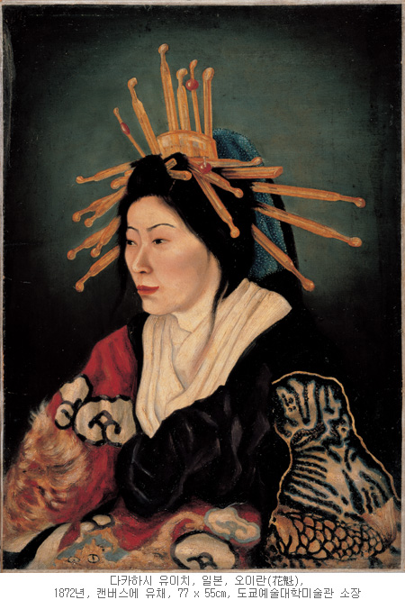 - 다카하시 유이치가 일본 메이지 유신 시기, 유곽(遊廓)의 위계 높은 기생 오이란(花魁)을 그린 초상화이다. 작가는 일본에 초빙된 이탈리아 화가 등을 찾아가 서양화 기법을 연마하기도 했지만, 거의 독학에 가까운 방식으로 유화를 익혔다. 대상을 아름답게 보이게 하려는 의도 없이, 나이든 기생의 모습을 있는 그대로 “기록”하는 일에 충실하고자 한다. 이는 대상 자체의 “객관성”을 중시하는 새로운 “리얼리즘”적 태도를 반영한다. 하지만, 동시에, 광대뼈가 튀어나온 얼굴 부분의 묘사를 위해 연백鉛白을 덧칠하는 등 전통적인 기법을 접목하기도 했다