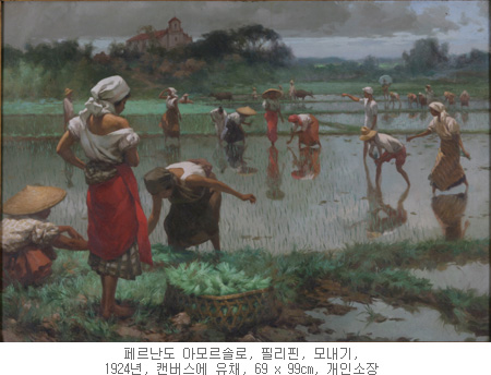 - 아모르솔로는 필리핀 근대 화가들 중 가장 많은 사랑을 받는 이에 속한다. 스페인의 오랜 식민지였던 필리핀은, 일찍부터 유화를 배우기 위해 스페인으로 유학 가는 일이 가능했고, 아모르솔로도 장학금을 받고 유럽여행을 한 바 있다. 여행 직후 그린 작품 <모내기>는, 열대의 태양아래 목가적인 전원 풍경과 건강하고 아름다운 농촌처녀의 묘사를 통해 “아모르솔로 화파”를 창시한 그의 대표작이다. 그의 전형적인 작품들은, 힘든 노동의 현실은 외면한 채, 자연과 인간의 이상적 조화만을 주제화했다는 점에서 비난을 받기도 했다. 오른쪽 원경에 우산을 들고 기타를 연주하는 사나이의 묘사가 그러한 분위기를 더욱 고취시키는 듯하다.