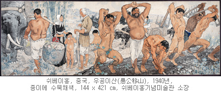 - 쉬베이홍은 이미 1919년 프랑스, 독일 등에서 유학하고, 1927년 귀국하여 중국 근대화단의 주도적 인물이 되었다. 유화와 중국화 모두를 최고의 기술로 구사했던 그는, 서구의 “리얼리즘”을 중국화에 접목시키는 나름의 방식을 개발하고 교육했다. 종이에 먹이라는 중국화의 전통 매체에, 숙련된 서양식 기법을 접목한 <우공이산>은, 중일전쟁의 기간 중인 1940년 인도의 타고르를 방문했을 때 완성된 작품이다(코끼리와 인도인의 등장에 주목하라). “우공이산”은 산을 옮기는 무모한 작업이라 하더라도, “내가 다하지 못하면 아들이 계속하고, 아들이 다하지 못하면 손자가 다하리라”며 끈질기게 매달린 나머지, 하늘이 산을 옮겨주었다는 고사에서 유래한다. 우공이 며느리를 통해 손자에게 가르침을 전해주라고 이르는 장면이 인상적이다. 이렇게 해서 언젠가는 일본에 대항한 전쟁에서 이길 수 있을 것임을 암시한다.
