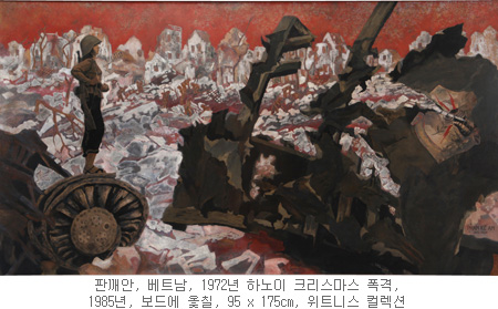 - 판께안은 인도차이나반도를 식민지화했던 프랑스에 의해 1925년 설립된 “인도차이나 에콜드보자르”의 마지막 입학생이었다. 학생시기부터 비엣 민의 지지자로 일본과 프랑스 저항운동에 참여했고, 호치민의 전속 초상화가로도 활약했다. 베트남전에 참전한 미국이 북베트남을 파리협정으로 끌어내기 위해, 하노이에 11일간 공습한 유명한, 하노이 크리스마스 폭격을 주제로 한 이 작품은, 사건 발생 13년 후에 그려졌다. 전쟁의 기억을 재생산하는 일은, 전쟁 후에도 국민단합의 일환으로 계속되었다(지금도 하노이의 한 호수 위에는 미군 공군기 B52의 잔해가 남아있다). 작가는 베트남의 전통공예기법인 옻칠을 활용하여, 여러 색상의 층을 덧입히는 특별한 수공예적 방식을 통해 회화적 효과를 창출하고 있다.